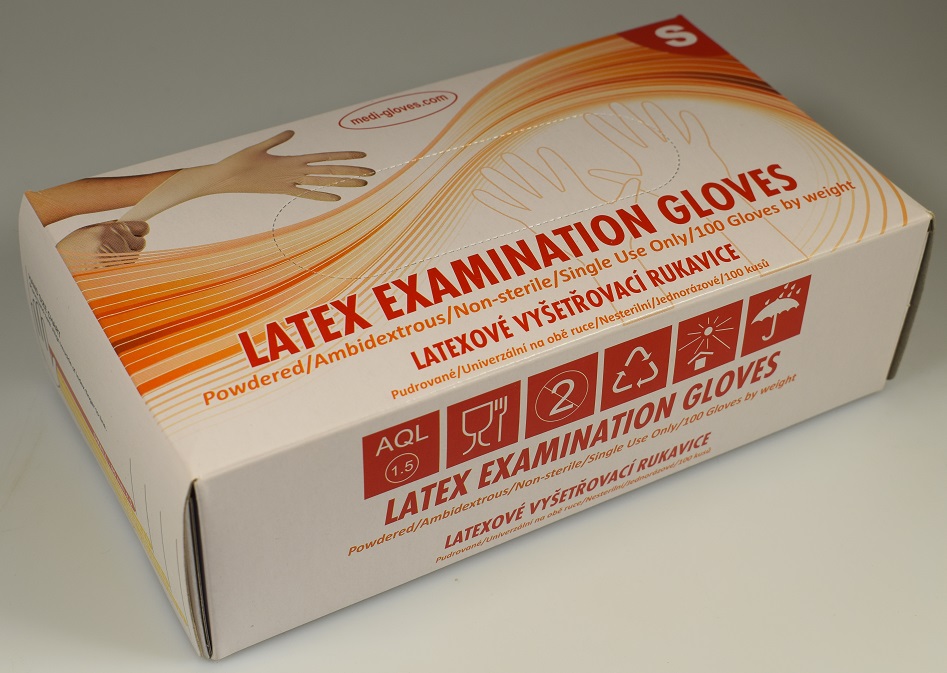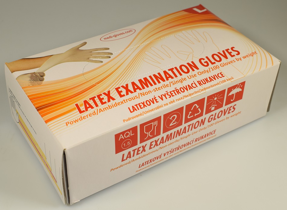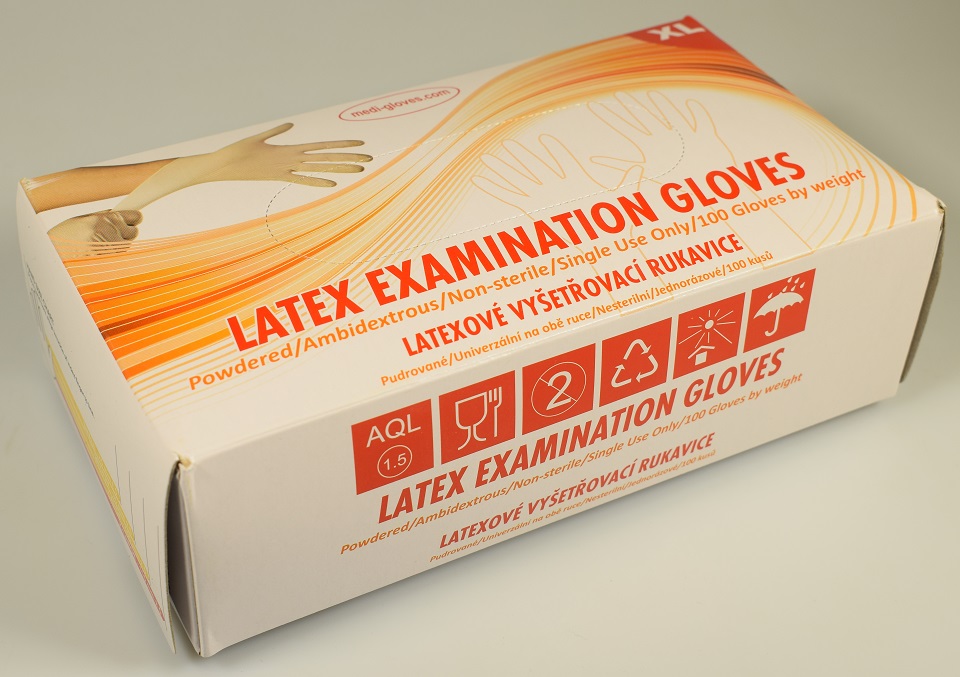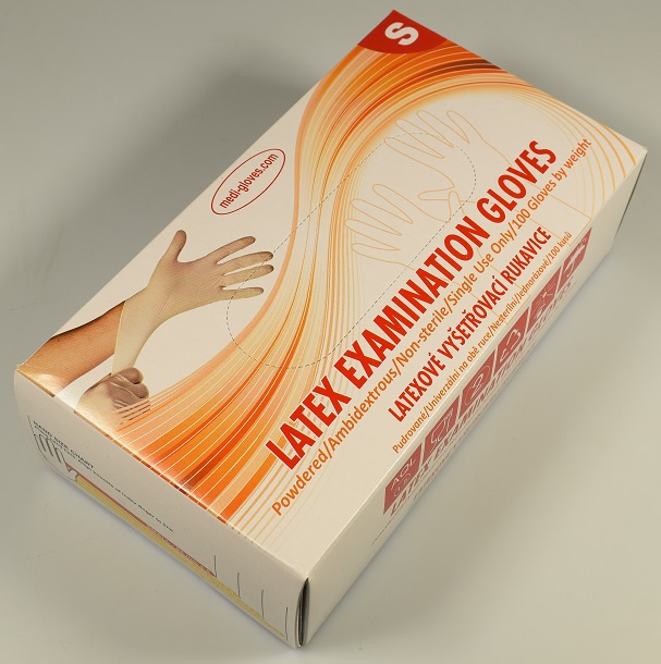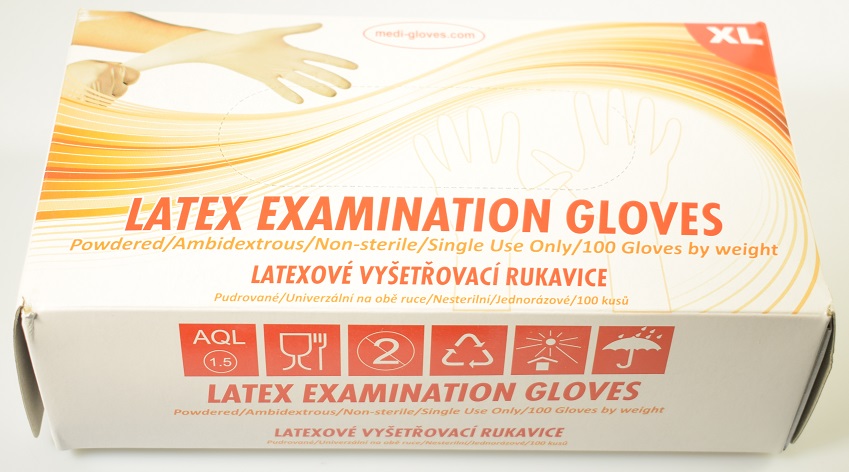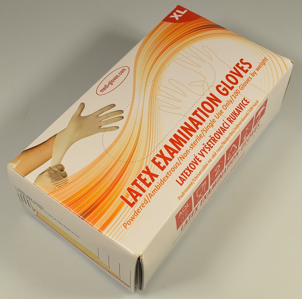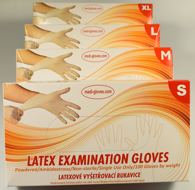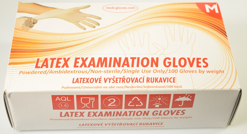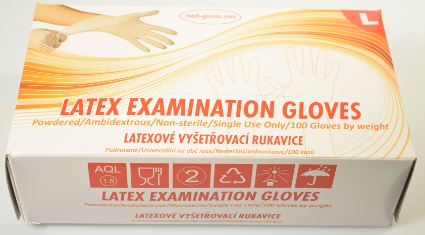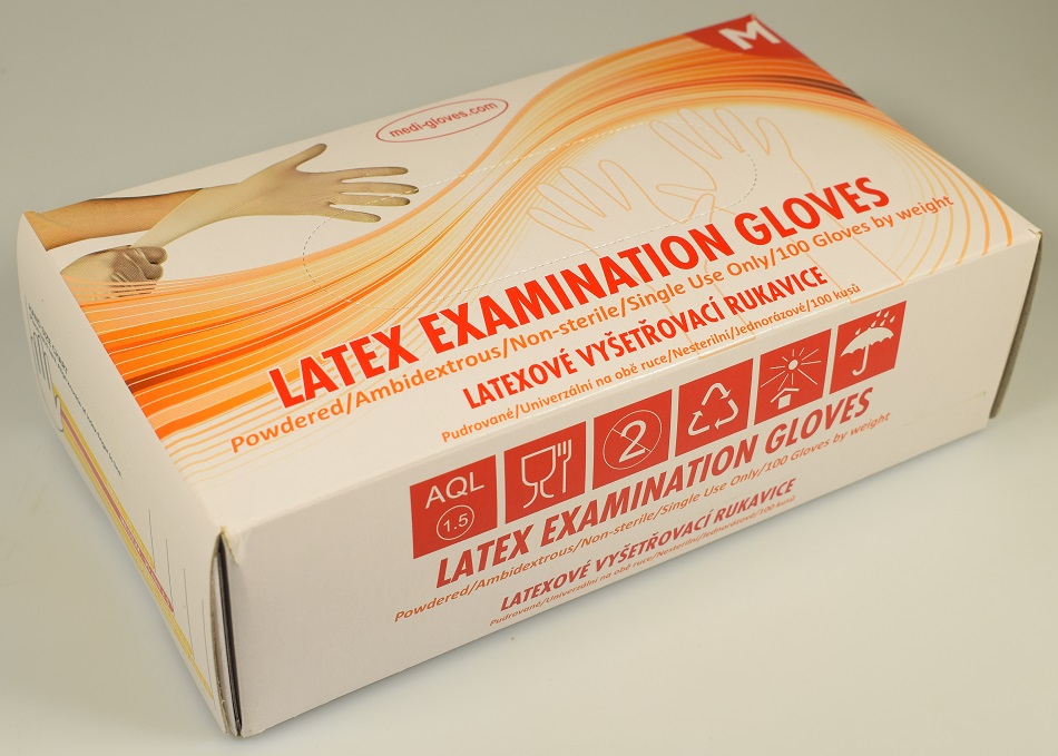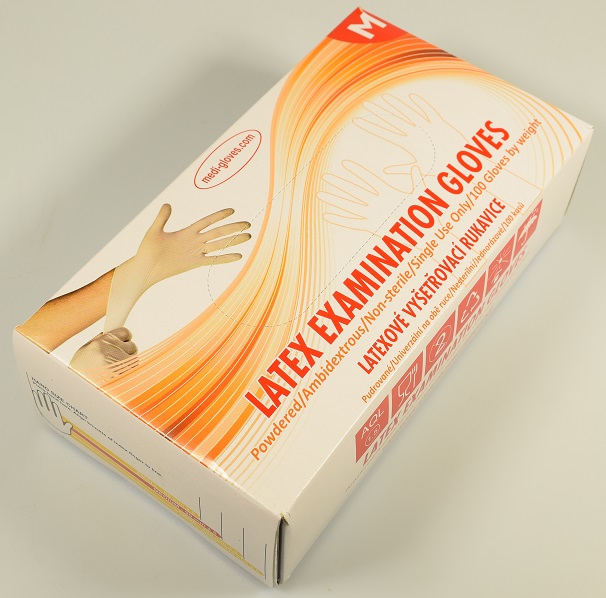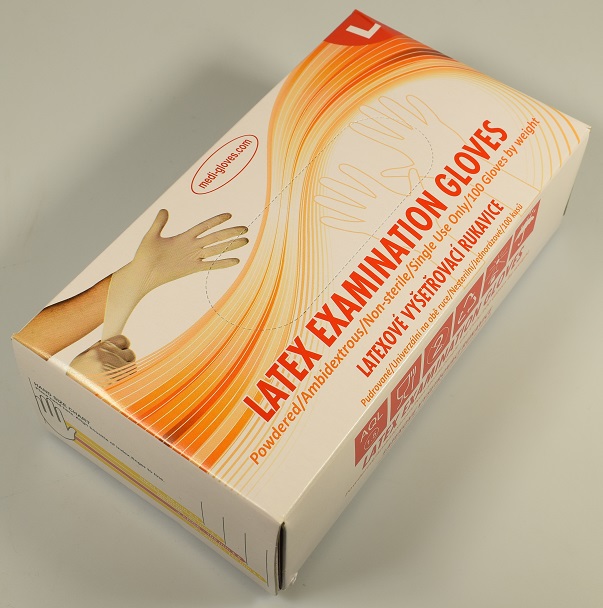 Latexové rukavice jsou vyrobeny z přírodního kaučuku. Snadno se nasazují, pro nositele jsou komfortní (neomezují v pohybu, dobře sedí, prsty si zachovávají dobrou citlivost). Verze pudrovaná – jedná se o jemný kukuřičný škrob, účelem pudrování vnitřní strany rukavic je jejich snadnější nasazení než u verze bez pudru. Nejsou sterilní.